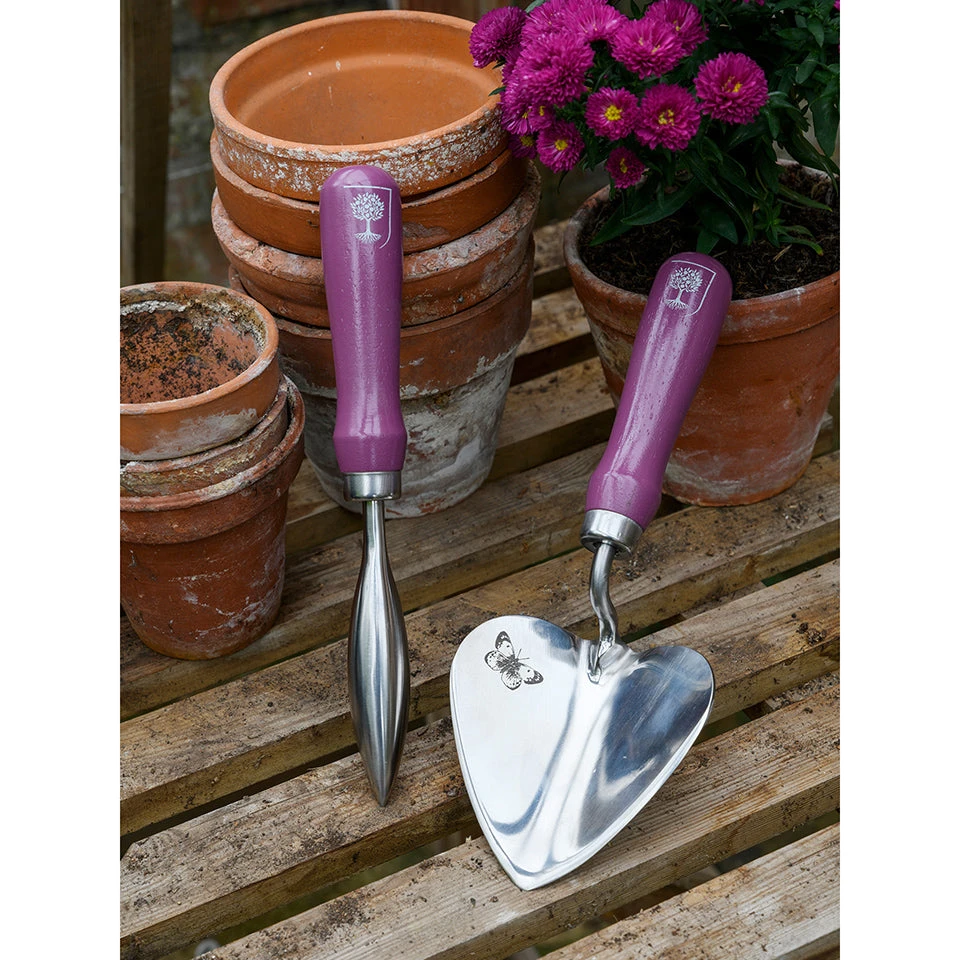 - The heart-shaped trowel features a delicate butterfly illustration and excels at shallow digging and soil scooping.
